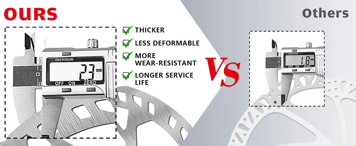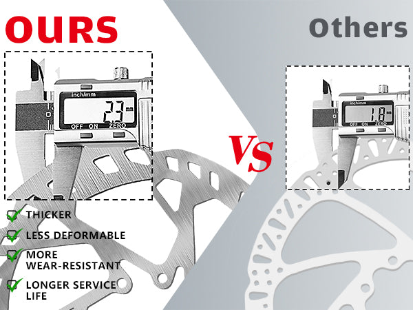 - 🚲【2,3 mm de grosor】Más gruesos, más resistentes al desgaste y menos deformables que los discos de freno convencionales, soportan temperaturas más altas y ofrecen mayor estabilidad de frenado. Ideales para ciclismo más agresivo y bicicletas eléctricas.