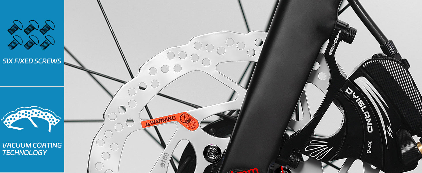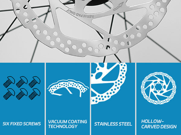 - 🚲 【Acabado al Vacío】Nuestra tecnología única aplica un acabado al vacío al rotor, lo que resulta en una superficie lisa y brillante que mejora la resistencia a la abrasión y la corrosión. Reduce el polvo, el ruido y las vibraciones durante el frenado, mejorando la suavidad y la seguridad.