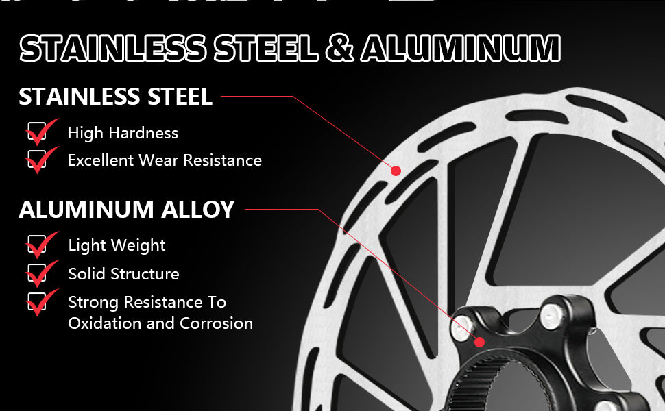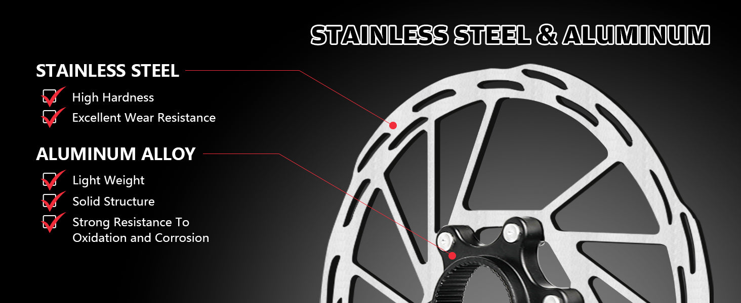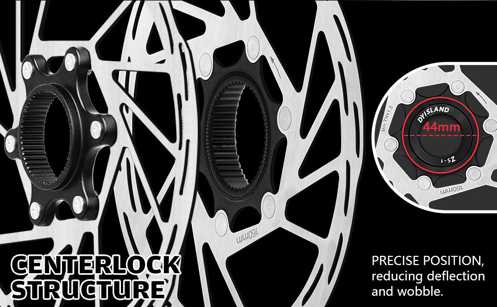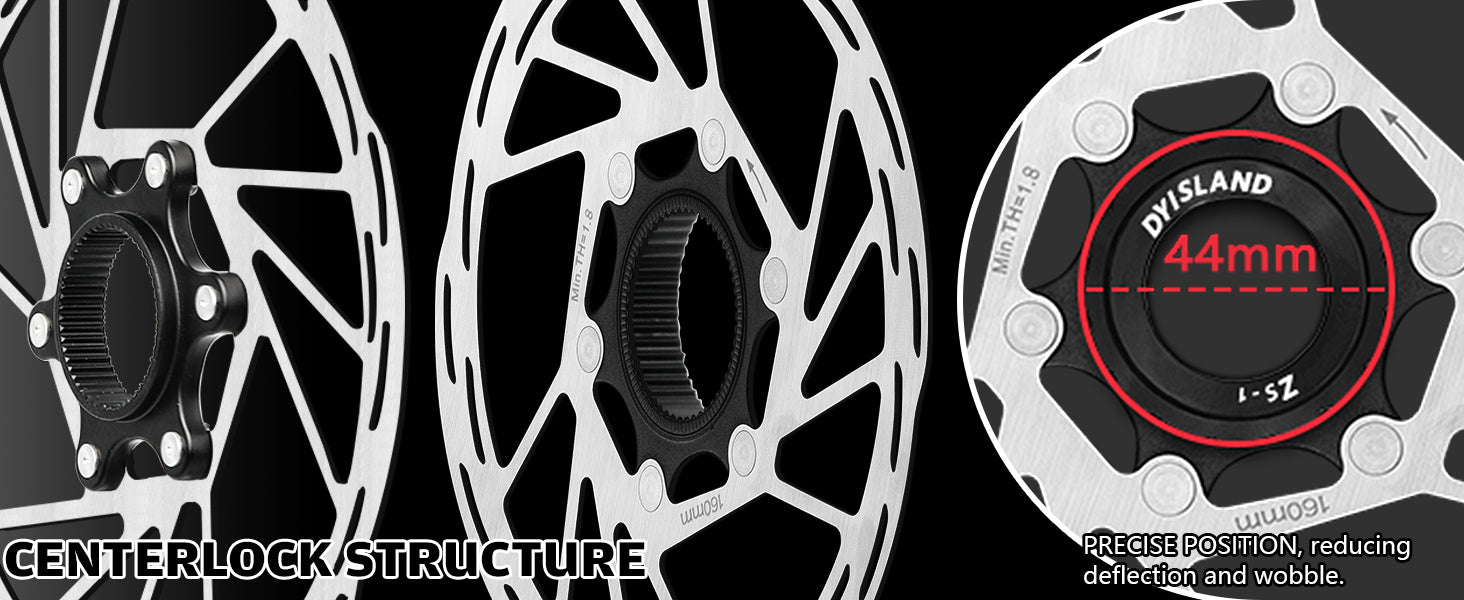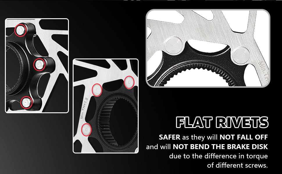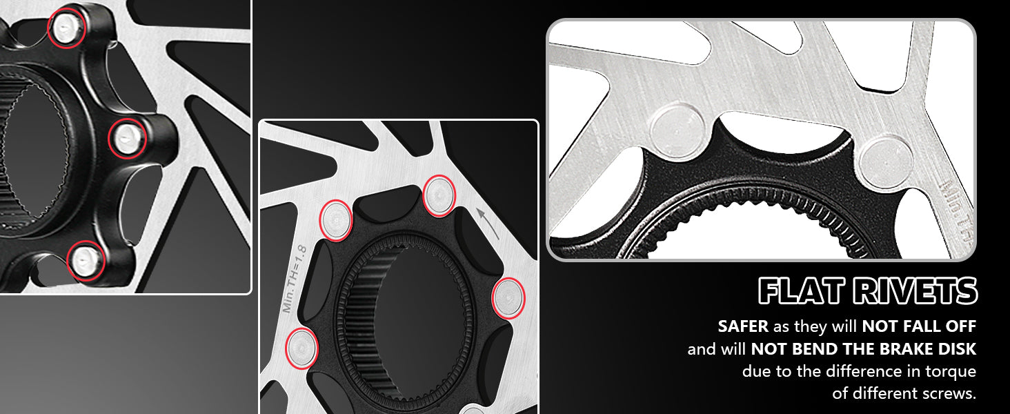 - š²ćCenterlock StructurećCompared to six-bolt brake rotors that may cause disc bending due to bolt torque differences, our center-lock discs have better resistance to bending and flat rivets that won't fall off, providing greater stability and security.