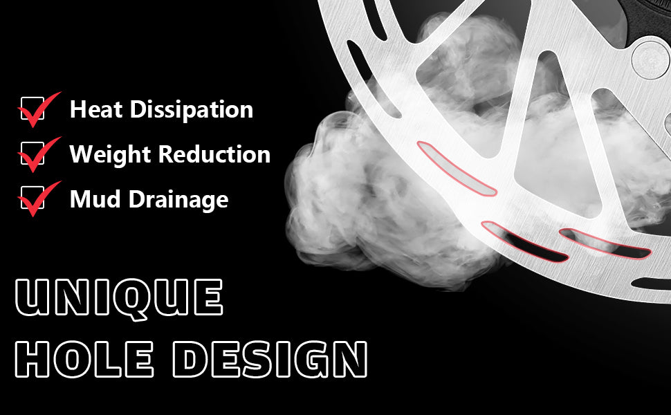 - šćExcellent PerfomancećOur unique circular hole design of rotor can increase the ventilation, reduce the weight, effectively drain the mud, improve braking force and sensitivity, and prolong the service life, giving you a better riding experience.