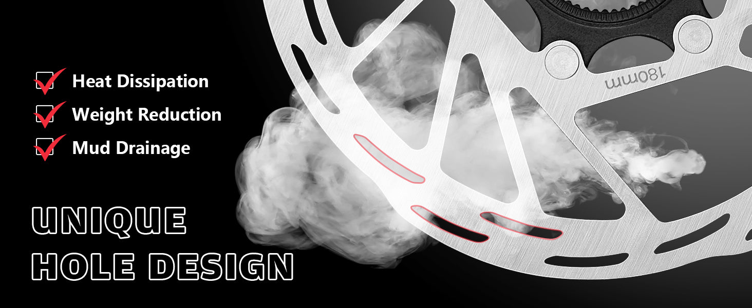 šćExcellentPerfomancećOuruniquecircularholedesignofrotorcanincreasetheventilation,reducetheweight,effectivelydrainthemud,improvebrakingforceandsensitivity,andprolongtheservicelife,givingyouabetterridingexperience.